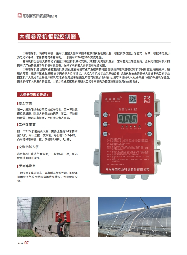 壽光龍?zhí)镛r業科技股份有限公司于2014年創(chuàng)立于“蔬菜之鄉”----山東壽光。公司立志用科技服務三農,以幫助農業企業和個人提高農業生產率,協助農業企業和個人生產健康安全的高品質農產品為使命。踐行“自強不息,厚德載物”的企業理念,專注于設施農業裝備研發(fā),研發(fā)生產了“溫室智腦”智慧農業物聯網系統、大棚智能放風機,“龍?zhí)ь^”大棚運輸車,“春暖花開”紅外反射大棚保溫被,大棚卷簾機等系列產品。公司于2017年在齊魯股權交易中心掛牌上市,股票代碼302505。 公司擁有注冊商標12個,實用新型專利18項,外觀專利4項,并獲得了ISO9001質量管理體系認證證書,2021-2023年科技型中小企業稱號。溫室智腦大棚放風機,獲得2020年度農業農村部舉辦的創(chuàng)新比賽優(yōu)秀獎。 2022年,中央網信辦、農業農村部、國家發(fā)展改革委、工業和信息化部、國家鄉村振興局聯合印發(fā)的《2022年數字鄉村發(fā)展工作要點》又進一步細化了智慧農業在2022年的重點任務,龍?zhí)镛r科將抓住歷史機遇,打造智能化的系列裝備,讓農業生產更高效,更智能。